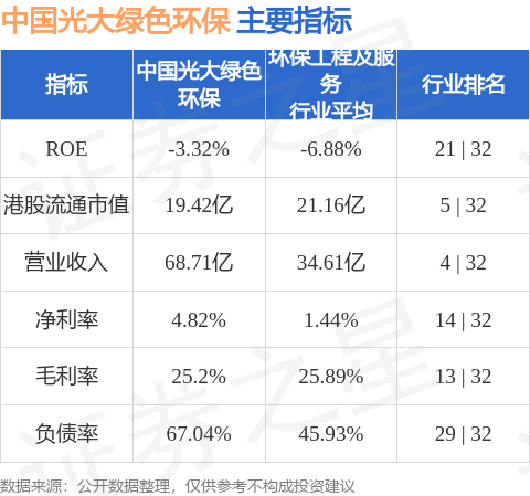 中国光大绿色环保港股市值19.42亿港元,在环保工程及服务行业中排名第5。主要指标见下表: