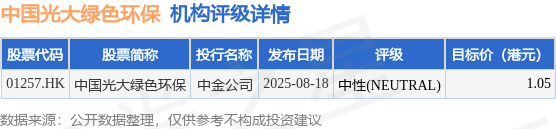 截至2025年11月7日收盘,中国光大绿色环保(01257.HK)报收于0.94港元,与上一交易日持平,成交量14.4万股,成交额13.4万港元。投行对该股的评级以中性(NEUTRAL)为主,近90天内共有1家投行给出中性(NEUTRAL)评级,近90天的目标均价为1.05港元。中金公司最新一份研报给予中国光大绿色环保中性(NEUTRAL)评级,目标价1.05港元。