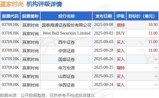 截至2025年11月7日收盘,赢家时尚(03709.HK)报收于8.26港元,下跌0.36%,成交量186.6万股,成交额1517.46万港元。投行对该股的评级以买入为主,近90天内共有5家投行给出买入评级,近90天的目标均价为10.82港元。国泰海通证券股份有限公司最新一份研报给予赢家时尚增持评级,目标价10.3港元。