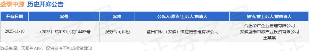 证券之星消息,根据天眼查APP显示,近日公布了一则安徽盛泰中源产业投资有限公司作为被告/被上诉人的开庭公告,详细内容如下: