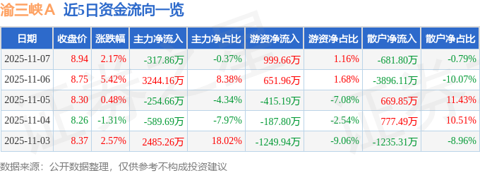 证券之星消息,截至2025年11月7日收盘,渝三峡A(000565)报收于8.94元,上涨2.17%,换手率21.96%,成交量95.22万手,成交额8.65亿元。