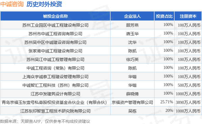 证券之星消息,根据天眼查APP显示,中诚咨询(920003.BJ)新增一起对外投资事件,被投资公司为苏州工业园区中诚工程建设有限公司,法定代表人顾芳燕,投资占比为100%。该公司从事专业技术服务业,注册资本为100万人民币。目前,中诚咨询共存在对外投资11项,详见下表: