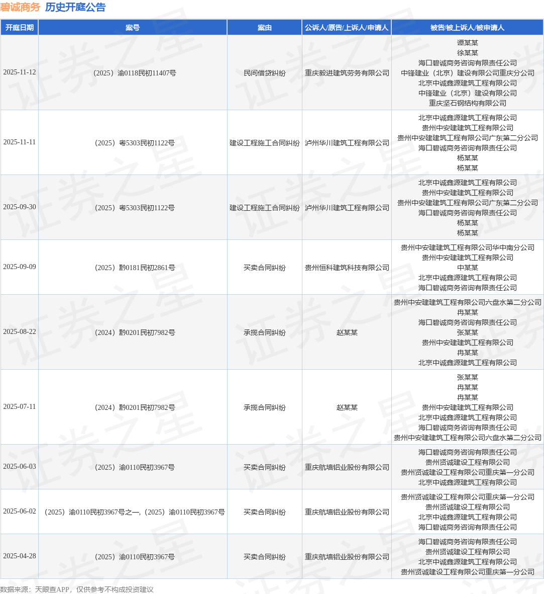 案号:(2025)粤5303民初1122号根据统计,近一年内以海口碧诚商务咨询有限责任公司为当事人的历史开庭公告有9则,其中案由为“买卖合同纠纷”的公告以4则居首,其次为“建设工程施工合同纠纷”有2则,“承揽合同纠纷”有2则。历史开庭公告如下: