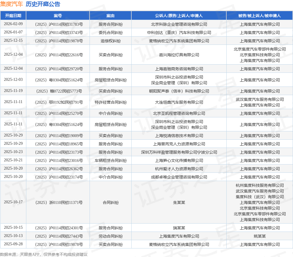 案号:(2025)沪0114民初25270号根据统计,近一年内以上海集度汽车有限公司为当事人的历史开庭公告有41则,其中案由为“服务合同纠纷”的公告以10则居首,其次为“买卖合同纠纷”有6则,“金融借款合同纠纷”有6则。历史开庭公告(前20条)如下: