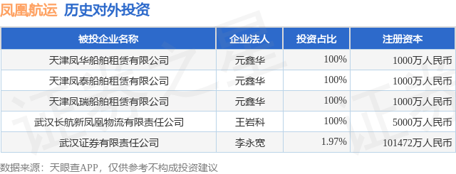 证券之星消息,根据天眼查APP显示,凤凰航运(000520.SZ)新增一起对外投资事件,被投资公司为天津凤华船舶租赁有限公司,法定代表人元鑫华,投资占比为100%。该公司从事水上运输业,注册资本为1000万人民币。目前,凤凰航运共存在对外投资5项,详见下表: