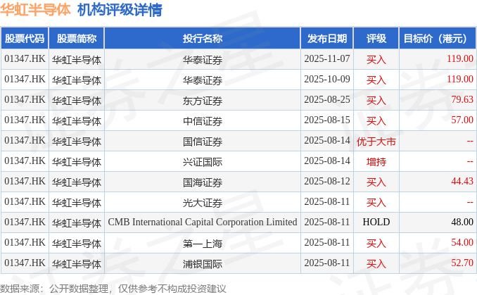 投行对该股的评级以买入为主,近90天内共有8家投行给出买入评级,近90天的目标均价为71.72港元。华泰证券最新一份研报给予华虹半导体买入评级,目标价119港元。