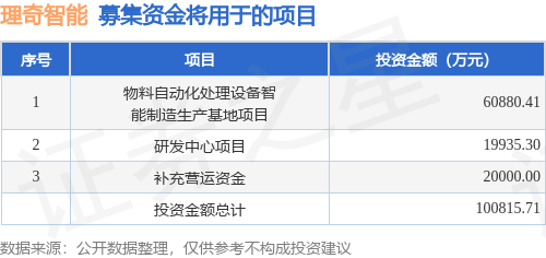 证券之星消息,无锡理奇智能装备股份有限公司(简称:理奇智能)拟在深交所创业板上市,募资总金额为10.08亿元,保荐机构为国泰海通证券股份有限公司。募集资金拟用于物料自动化处理设备智能制造生产基地项目、研发中心项目、补充营运资金,详见下表: