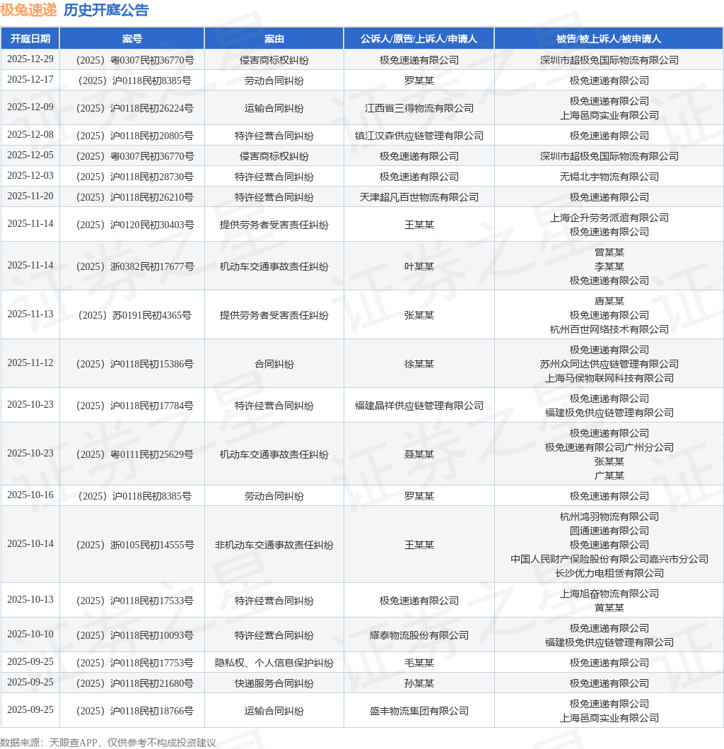 案号:(2025)浙0382民初17677号根据统计,近一年内以极兔速递有限公司为当事人的历史开庭公告有150则,其中案由为“特许经营合同纠纷”的公告以63则居首,其次为“快递服务合同纠纷”有18则,“机动车交通事故责任纠纷”有12则。历史开庭公告(前20条)如下: