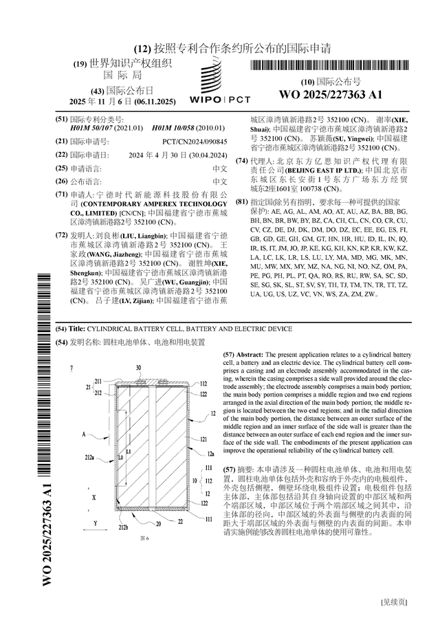 证券之星消息,根据企查查数据显示宁德时代(300750)公布了一项国际专利申请,专利名为“圆柱电池单体、电池和用电装置”,专利申请号为PCT/CN2024/090845,国际公布日为2025年11月6日。
