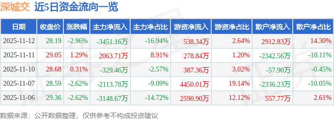 证券之星消息,截至2025年11月12日收盘,深城交(301091)报收于28.19元,下跌2.96%,换手率1.37%,成交量7.21万手,成交额2.04亿元。