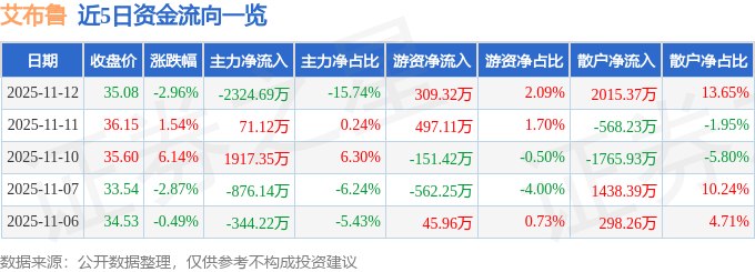 证券之星消息,截至2025年11月12日收盘,艾布鲁(301259)报收于35.08元,下跌2.96%,换手率4.23%,成交量4.18万手,成交额1.48亿元。