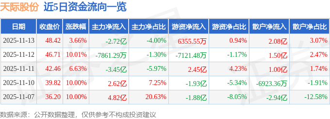 证券之星消息,截至2025年11月13日收盘,天际股份(002759)报收于48.42元,上涨3.66%,换手率28.26%,成交量141.54万手,成交额67.89亿元。