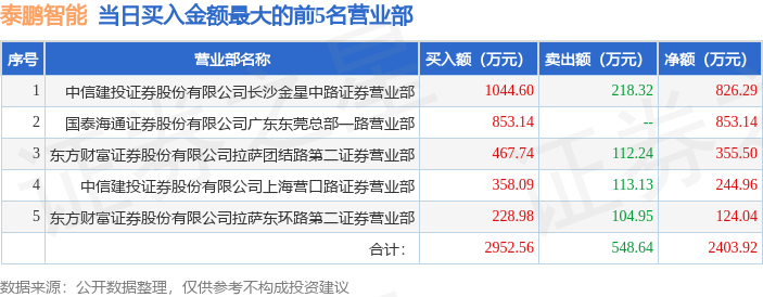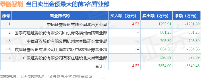 证券之星消息,沪深交易所2025年11月14日公布的交易公开信息显示,泰鹏智能(920132)因当日换手率达到20%的前5只股票登上龙虎榜。此次是近5个交易日内第2次上榜。