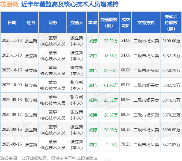 芯朋微近半年内的董监高及核心技术人员增减持详情如下: