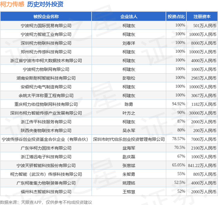 证券之星消息,根据天眼查APP显示,柯力传感(603662.SH)新增一起对外投资事件,被投资公司为无锡北微传感科技有限公司,法定代表人王春波,投资占比为1.3%。该公司从事计算机、通信和其他电子设备制造业,注册资本为1000万人民币。目前,柯力传感共存在对外投资40项,投资占比前20的项目见下表: