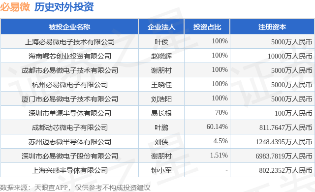 证券之星消息,根据天眼查APP显示,必易微(688045.SH)新增一起对外投资事件,被投资公司为上海兴感半导体有限公司,法定代表人钟小军,投资占比为-。该公司从事软件和信息技术服务业,注册资本为802.2352万人民币。目前,必易微共存在对外投资10项,详见下表: