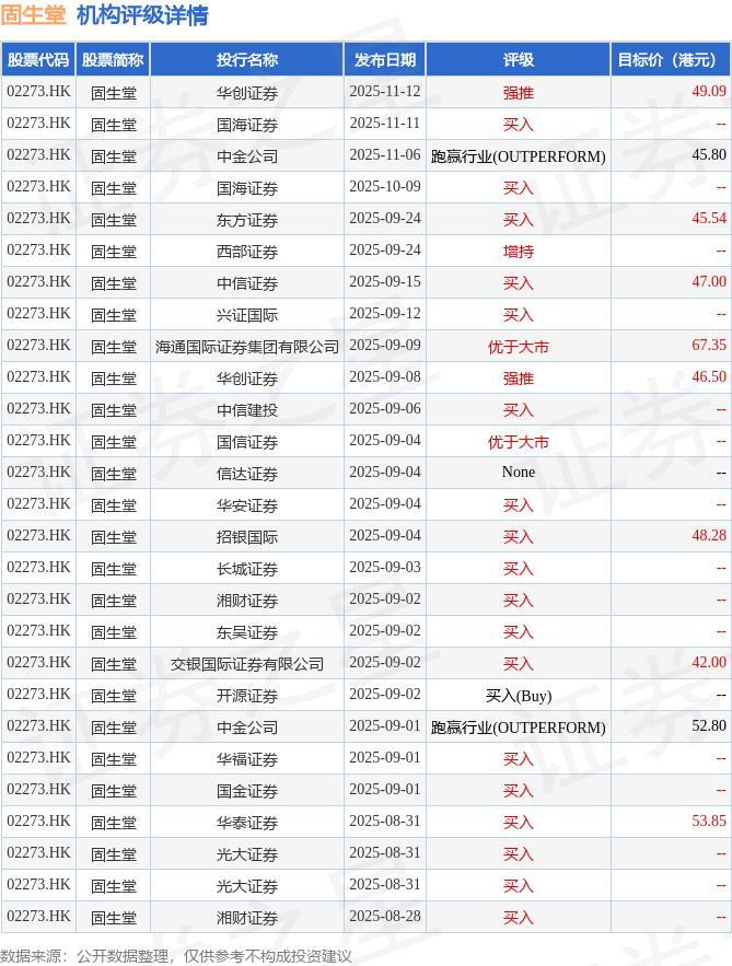 投行对该股的评级以买入为主,近90天内共有18家投行给出买入评级,近90天的目标均价为49.82港元。华创证券最新一份研报给予固生堂强推评级,目标价49.09港元。