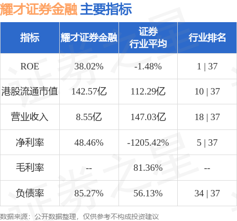 耀才证券金融港股市值142.57亿港元,在证券行业中排名第10。主要指标见下表: