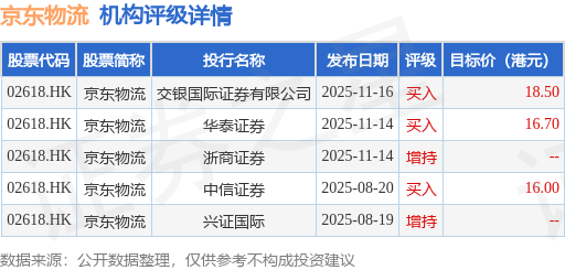 投行对该股的评级以买入为主,近90天内共有3家投行给出买入评级,近90天的目标均价为17.07港元。交银国际证券有限公司最新一份研报给予京东物流买入评级,目标价18.5港元。