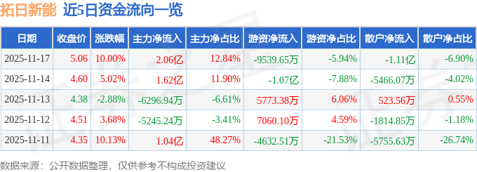 证券之星消息,拓日新能11月17日涨停收盘,收盘价5.06元。该股于9点30分涨停,9次打开涨停,截止收盘封单资金为5453.97万元,占其流通市值0.77%。