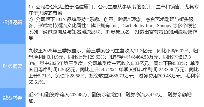 证券之星消息,九牧王11月17日涨停收盘,收盘价13.84元。该股于9点25分涨停,1次打开涨停,截止收盘封单资金为1.11亿元,占其流通市值1.39%。