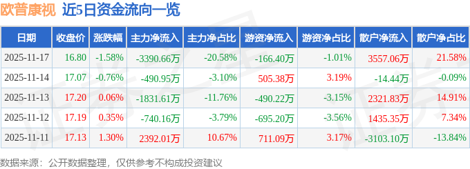 证券之星消息,截至2025年11月17日收盘,欧普康视(300595)报收于16.8元,下跌1.58%,换手率1.46%,成交量9.78万手,成交额1.65亿元。