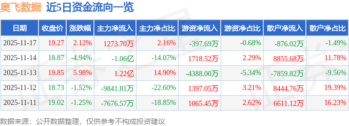 证券之星消息,截至2025年11月17日收盘,奥飞数据(300738)报收于19.27元,上涨2.12%,换手率3.12%,成交量30.76万手,成交额5.89亿元。
