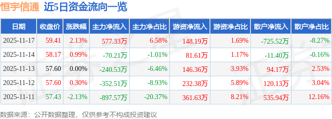 证券之星消息,截至2025年11月17日收盘,恒宇信通(300965)报收于59.41元,上涨2.13%,换手率2.63%,成交量1.46万手,成交额8777.63万元。