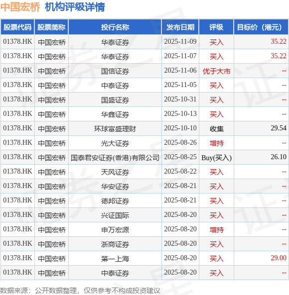 投行对该股的评级以买入为主,近90天内共有12家投行给出买入评级,近90天的目标均价为31.02港元。华泰证券最新一份研报给予中国宏桥买入评级,目标价35.22港元。