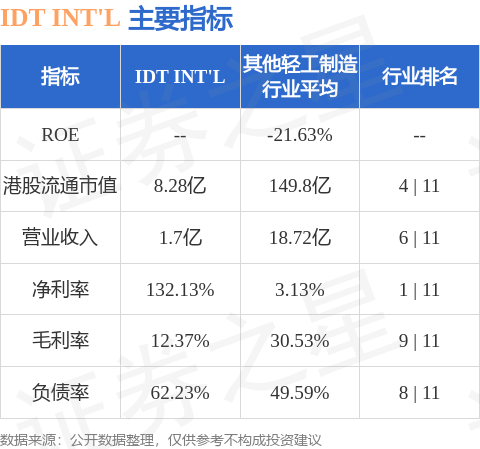 IDT INT'L港股市值8.28亿港元,在其他轻工制造行业中排名第4。主要指标见下表:
