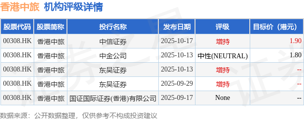 投行对该股的评级以增持为主,近90天内共有3家投行给出增持评级,近90天的目标均价为1.85港元。中信证券最新一份研报给予香港中旅增持评级,目标价1.9港元。