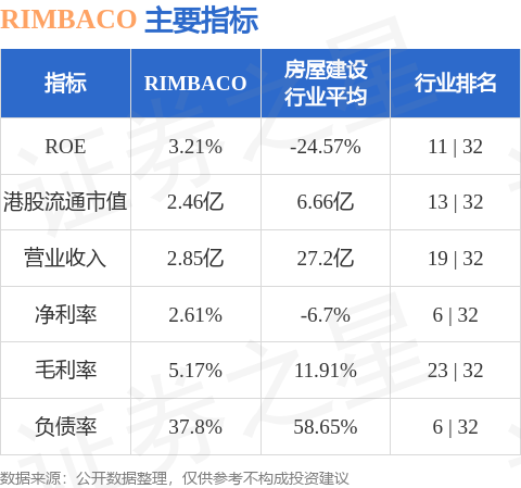 RIMBACO港股市值2.46亿港元,在房屋建设行业中排名第13。主要指标见下表:
