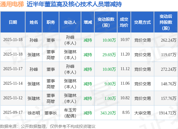 证券之星消息,根据11月19日市场公开信息、上市公司公告及交易所披露数据整理,通用电梯(300931)最新董监高及相关人员股份变动情况:2025年11月18日公司董事,高管张建林、董事孙峰共减持公司股份39.69万股,占公司总股本为0.1652%。变动期间公司股价上涨3.53%,11月18日当日收盘报11.43元。