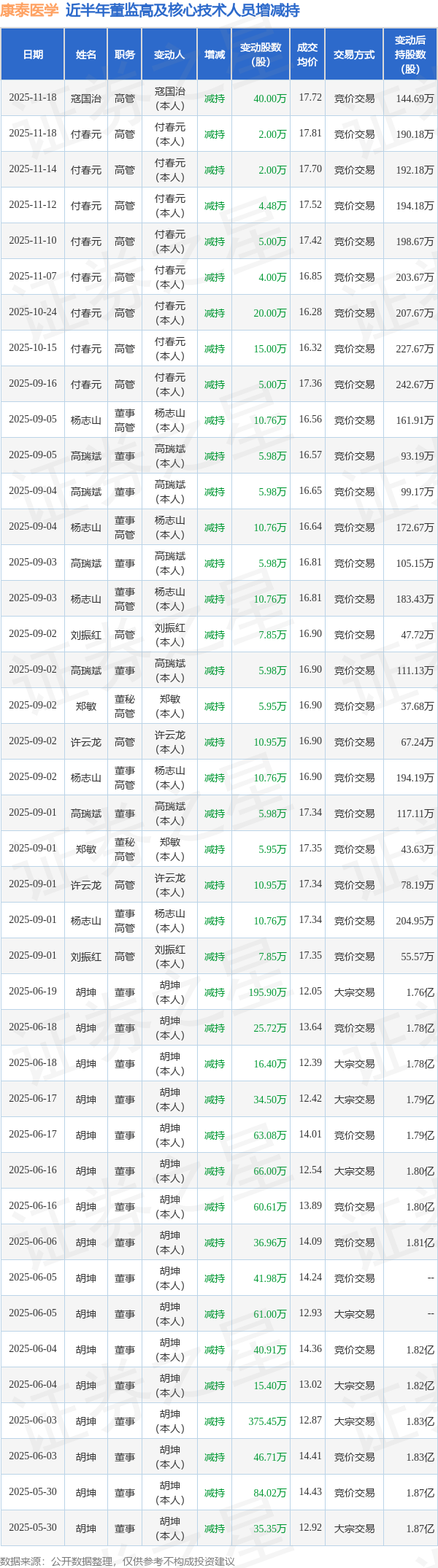康泰医学近半年内的董监高及核心技术人员增减持详情如下: