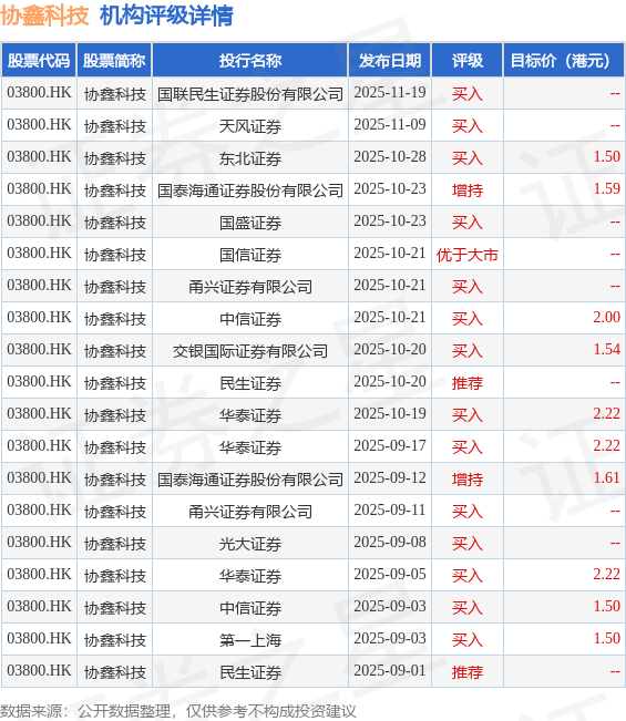 截至2025年11月19日收盘,协鑫科技(03800.HK)报收于1.23港元,与上一交易日持平,成交量3.82亿股,成交额4.65亿港元。投行对该股的评级以买入为主,近90天内共有14家投行给出买入评级,近90天的目标均价为1.79港元。国联民生证券股份有限公司最新一份研报给予协鑫科技买入评级。