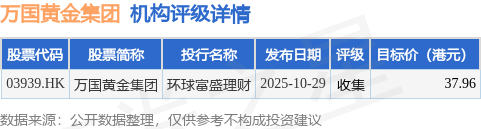 投行对该股的评级以收集为主,近90天内共有1家投行给出收集评级,近90天的目标均价为37.96港元。环球富盛理财最新一份研报给予万国黄金集团收集评级,目标价37.96港元。