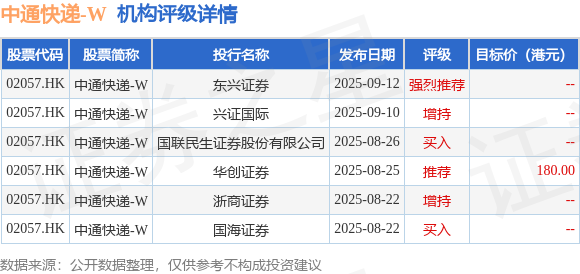 投行对该股的评级以增持为主,近90天内共有2家投行给出增持评级,近90天的目标均价为180港元。东兴证券最新一份研报给予中通快递-W强烈推荐评级。