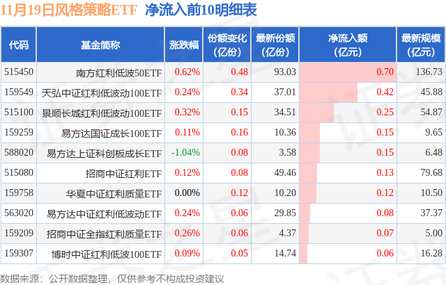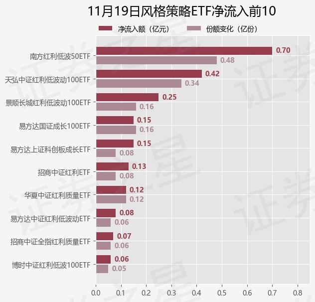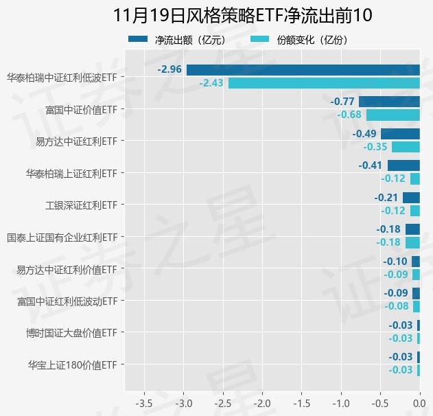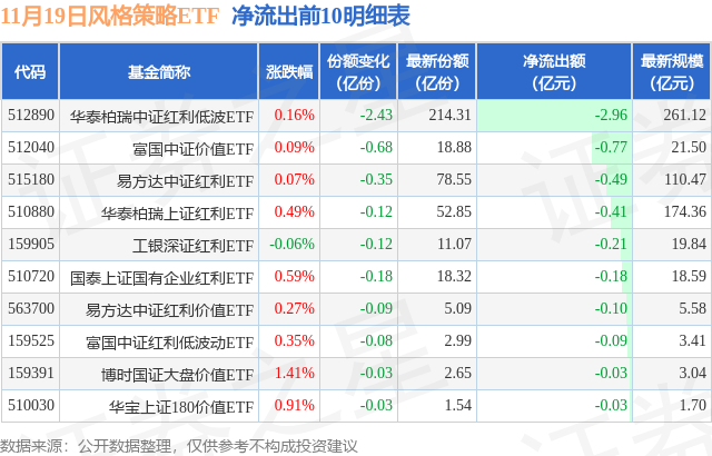 当日有18只风格策略ETF基金出现资金净流出,其中净流出排首位的是华泰柏瑞中证红利低波ETF(512890),份额减少了2.43亿份,净流出额为2.96亿元。