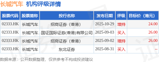投行对该股的评级以增持为主,近90天内共有2家投行给出增持评级,近90天的目标均价为25.33港元。招商证券(香港)最新一份研报给予长城汽车增持评级,目标价24港元。