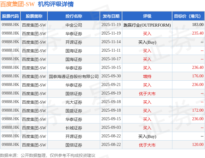 投行对该股的评级以买入为主,近90天内共有9家投行给出买入评级,近90天的目标均价为199.35港元。中金公司最新一份研报给予百度集团-SW跑赢行业(OUTPERFORM)评级,目标价183港元。
