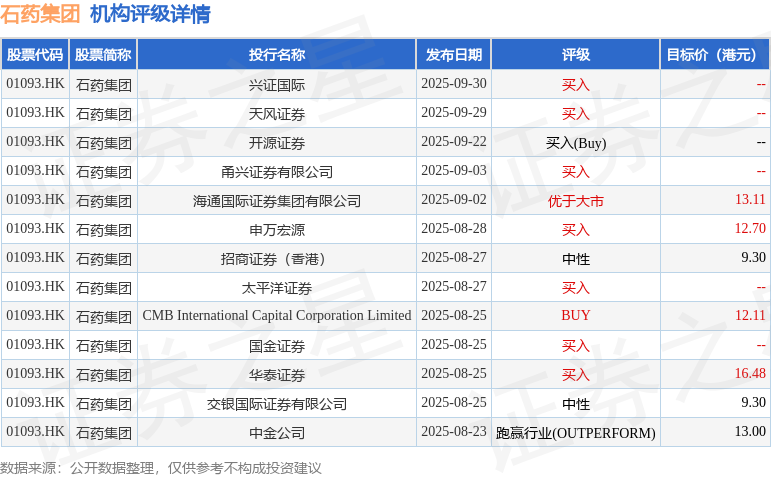 投行对该股的评级以买入为主,近90天内共有7家投行给出买入评级,近90天的目标均价为12.29港元。兴证国际最新一份研报给予石药集团买入评级。