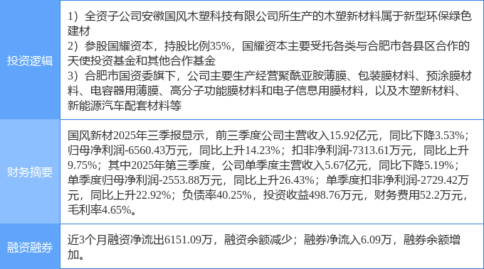 证券之星消息,国风新材11月20日涨停收盘,收盘价7.89元。该股于9点25分涨停,1次打开涨停,截止收盘封单资金为9331.03万元,占其流通市值1.32%。