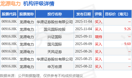 截至2025年11月20日收盘,龙源电力(00916.HK)报收于6.99港元,下跌0.29%,成交量1248.56万股,成交额8745.95万港元。投行对该股的评级以买入为主,近90天内共有6家投行给出买入评级,近90天的目标均价为9.43港元。兴证国际最新一份研报给予龙源电力增持评级。