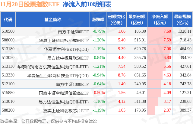 当日有230只股票指数ETF基金出现资金净流入,其中净流入排首位的是南方中证500ETF(510500),份额增加了1.06亿份,净流入额为7.6亿元。