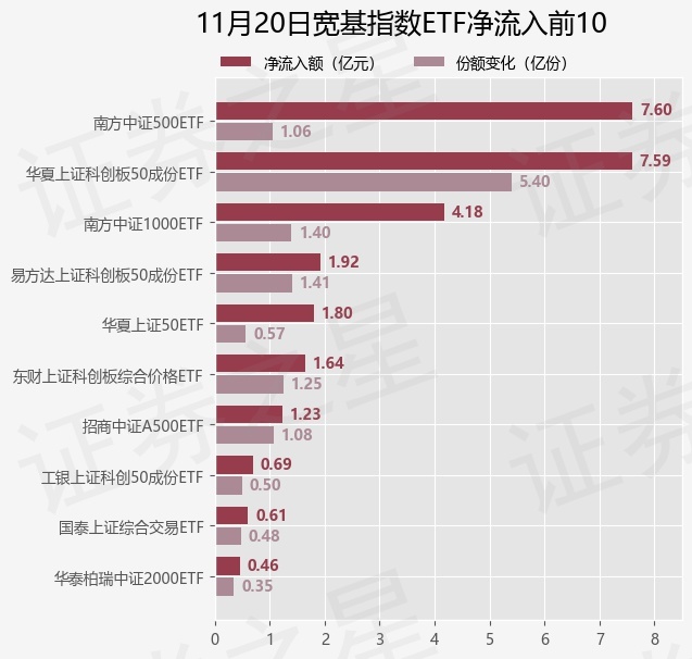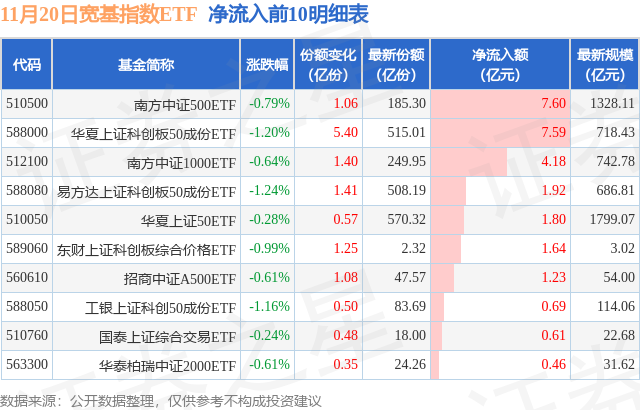 当日有49只宽基指数ETF基金出现资金净流入,其中净流入排首位的是南方中证500ETF(510500),份额增加了1.06亿份,净流入额为7.6亿元。