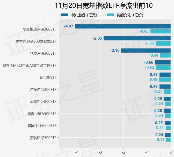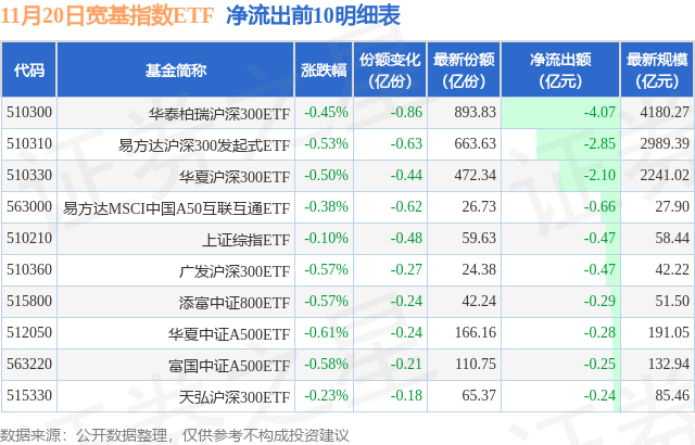 当日有33只宽基指数ETF基金出现资金净流出,其中净流出排首位的是华泰柏瑞沪深300ETF(510300),份额减少了8640.0万份,净流出额为4.07亿元。