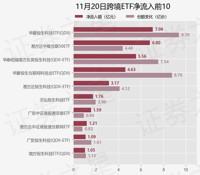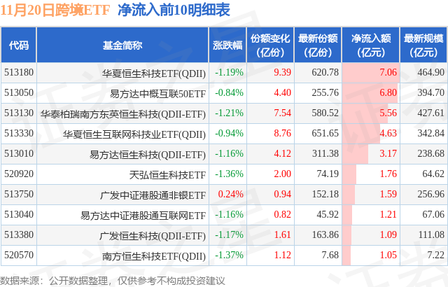 当日有54只跨境ETF基金出现资金净流入,其中净流入排首位的是华夏恒生科技ETF(QDII)(513180),份额增加了9.39亿份,净流入额为7.06亿元。