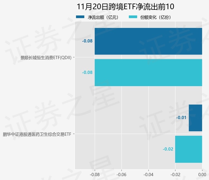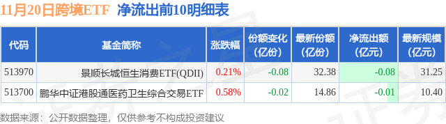 当日有2只跨境ETF基金出现资金净流出,其中净流出排首位的是景顺长城恒生消费ETF(QDII)(513970),份额减少了800.0万份,净流出额为771.1万元。