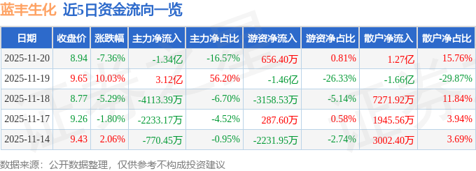 11月20日的资金流向数据方面,主力资金净流出1.34亿元,占总成交额16.57%,游资资金净流入656.4万元,占总成交额0.81%,散户资金净流入1.27亿元,占总成交额15.76%。