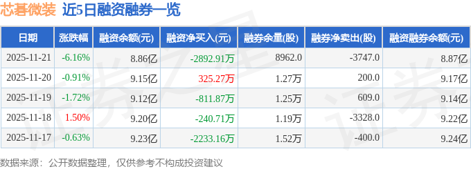 芯碁微装融资融券信息显示,融资方面,当日融资买入5100.77万元,融资偿还7993.68万元,融资净偿还2892.91万元。融券方面,融券卖出0.0股,融券偿还3747.0股,融券余量8962.0股,融券余额95.0万元。融资融券余额8.87亿元。